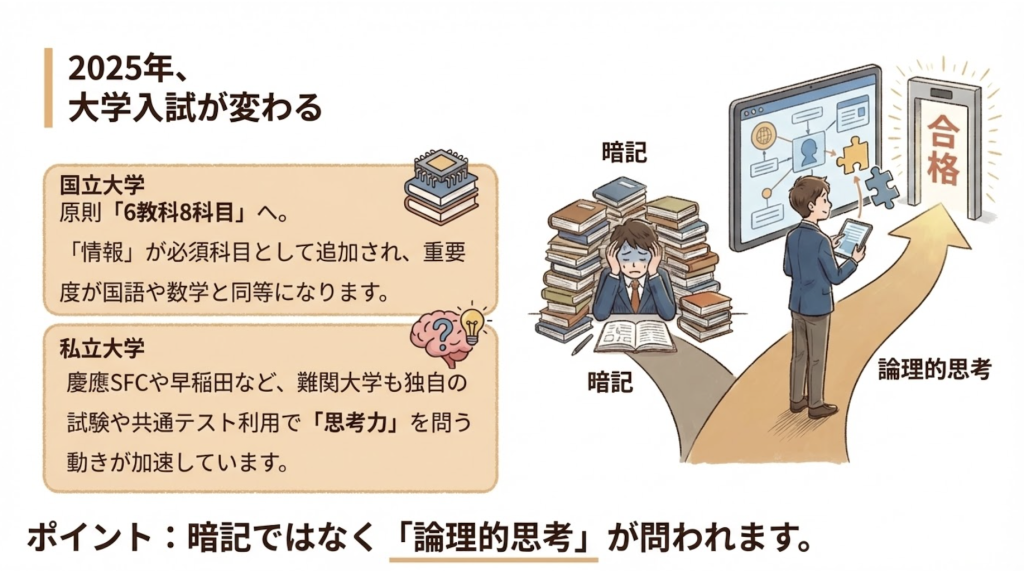 予測困難な社会変化を踏まえ、大学入試も学力のみを問う「一般入試」が減少し、受験生の個性、探究心、そして将来のビジョンを多面的に評価する総合型選抜へ大きく変化しています。いま、問われているのは自分の力で課題を見つけ解決する力。まさにアントレプレナーシップです。