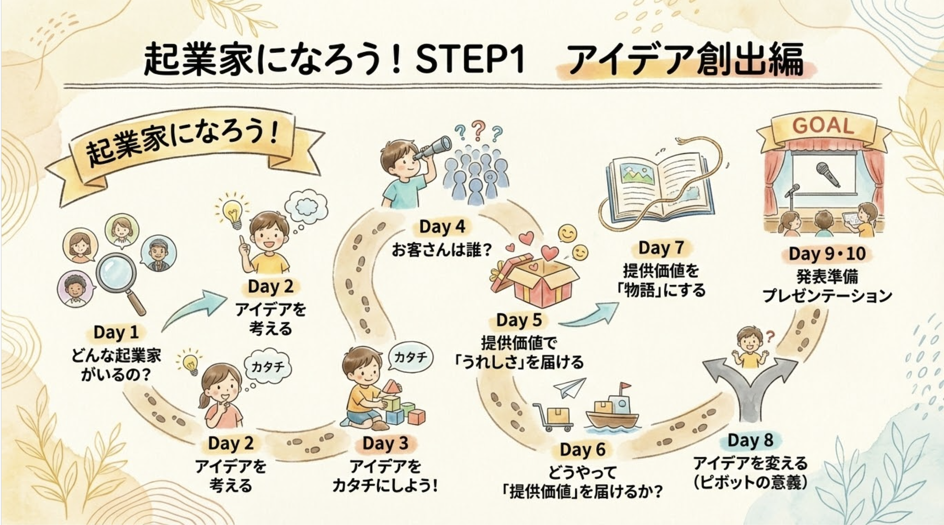 一方で、「本当にこのままでいいのか?」という漠然とした不安を抱えている保護者の声も多く耳にします。この主体性で大切なのは、自分の「やりたい!」を自分自身が自己決定するプロセスです。起業家教育はまさにそのプロセスをたどります。