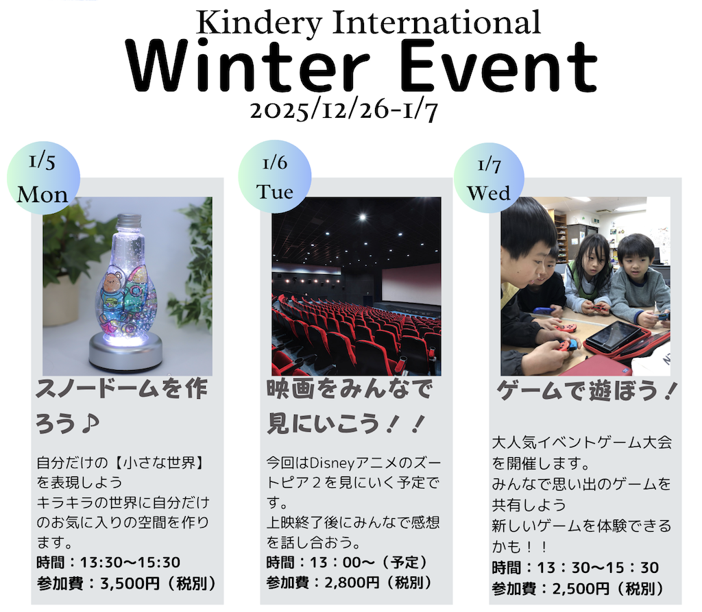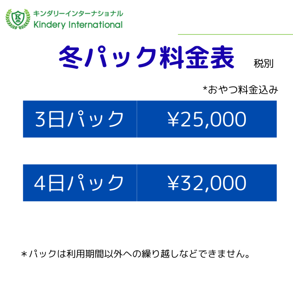 「冬休みスポット会員」は冬休み期間中に、利用日を決めて「キンダリーインターナショナル」を冬休み期間に利用いただけるサービスです。